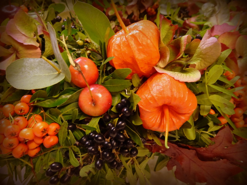 vuurdoorn, malusappeltjes, physalis (lampionnetjes),